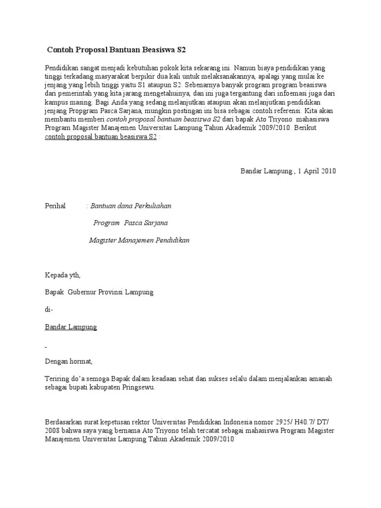 Adapun maksud dan tujuan proposal ini adalah untuk mengajukan permohonan bantuan biaya pendidikan (beasiswa) kepada instansi pemerintah, para donatur, sponsor . Sekolah tinggi ilmu kesehatan (stikes). Bandar lampung , 1 april 2010. Contoh proposal bantuan beasiswa s2 : Program doktor yang diselenggarakan adalah program doktor ilmu hukum dan pendidikan agama islam.